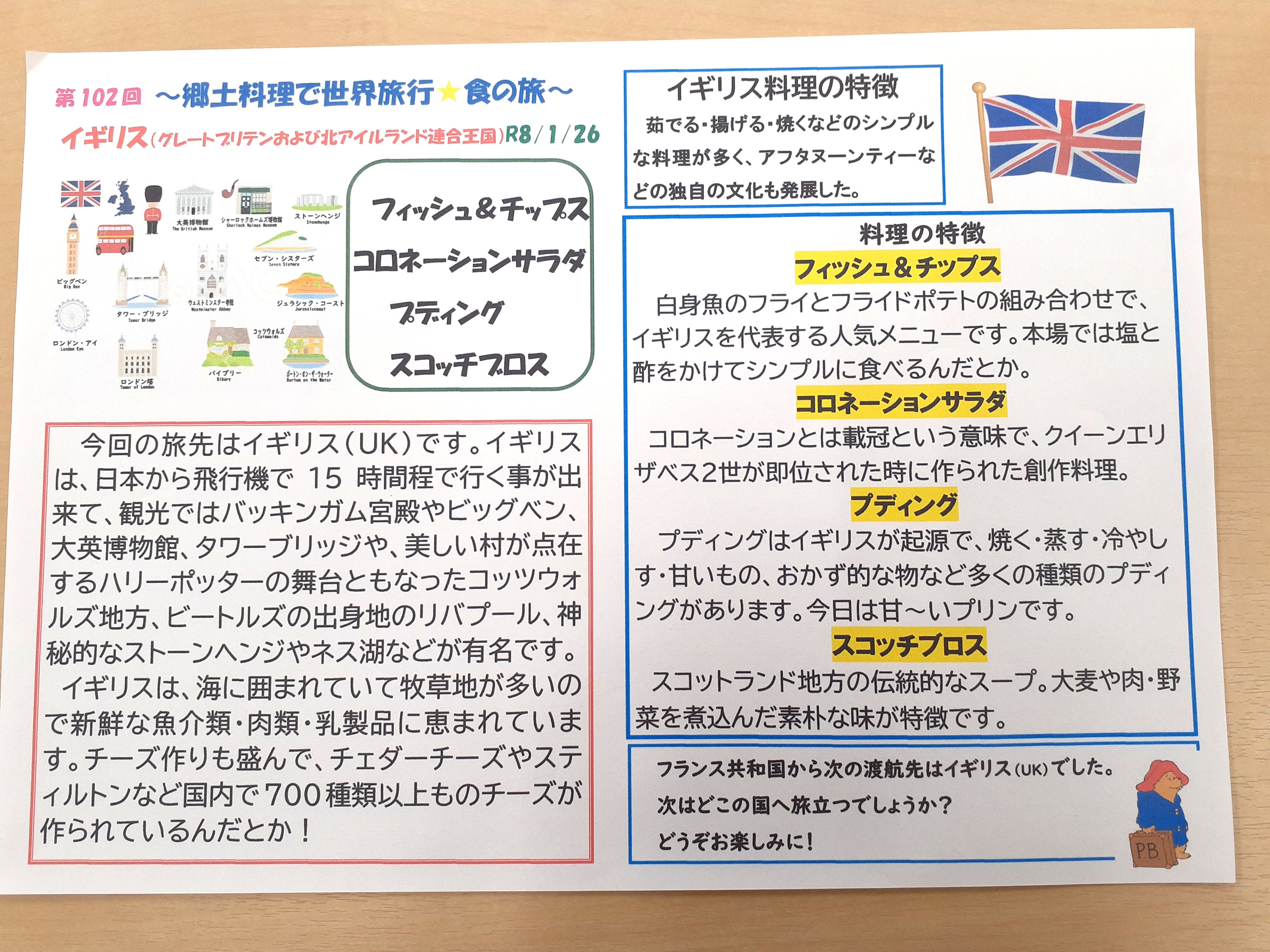 ~郷土料理で世界旅行☆食の旅~ 世界旅行の食旅第十弾は、イギリス料理となります。メニューは、フィッシュ&チップス、コロネーションサラダ、プディング、スコッチブロスです。 ご利用者からは「スコッチってお酒かい?食べれるかしら?」「イギリス料理なんて食べたことない。おいしいのね。」などのお声をいただきました。 今後も食旅はつづきます!